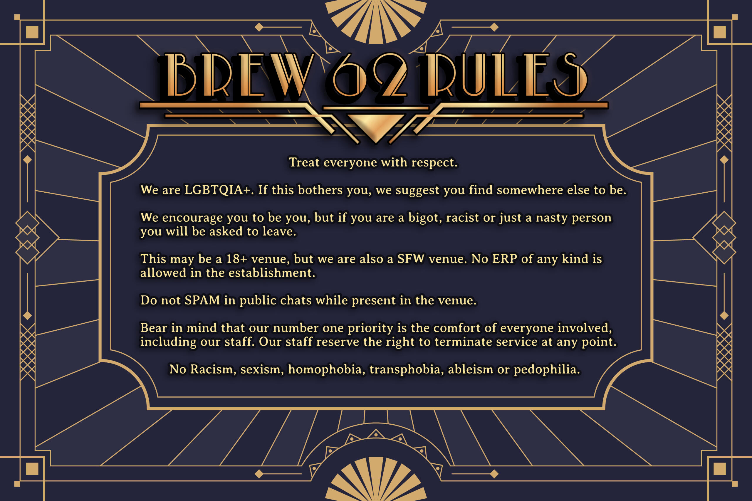 This page is a work in progress. So instead, what we're gonna ask is that you please pretend like we were able to come up with like, an incredible feature-film-length tearjerker about our founding and how much it means to us, specifically and personally.Because we get it. We really do. The Gridanian Prohibition has been so very difficult for all of us. It's been difficult for a kind, law-abiding, Twelve-fearing, upstanding establishment like ours to stay afloat in these trying times.Some days, it seems like in order for us little guys to keep our heads above the water, we'd need to build a secret doorway in a bookcase in the building, and have the lovely guest click on the doorway next to the bookshelf, which would take them to the secret selection of alcoholic beverages. (Which, of course, is all something we would never do.)Gridania's finest speak-easy. Remember the name, remember the location: Brew 62.Hyperion, Lavender Beds, Ward 6, Plot 2.